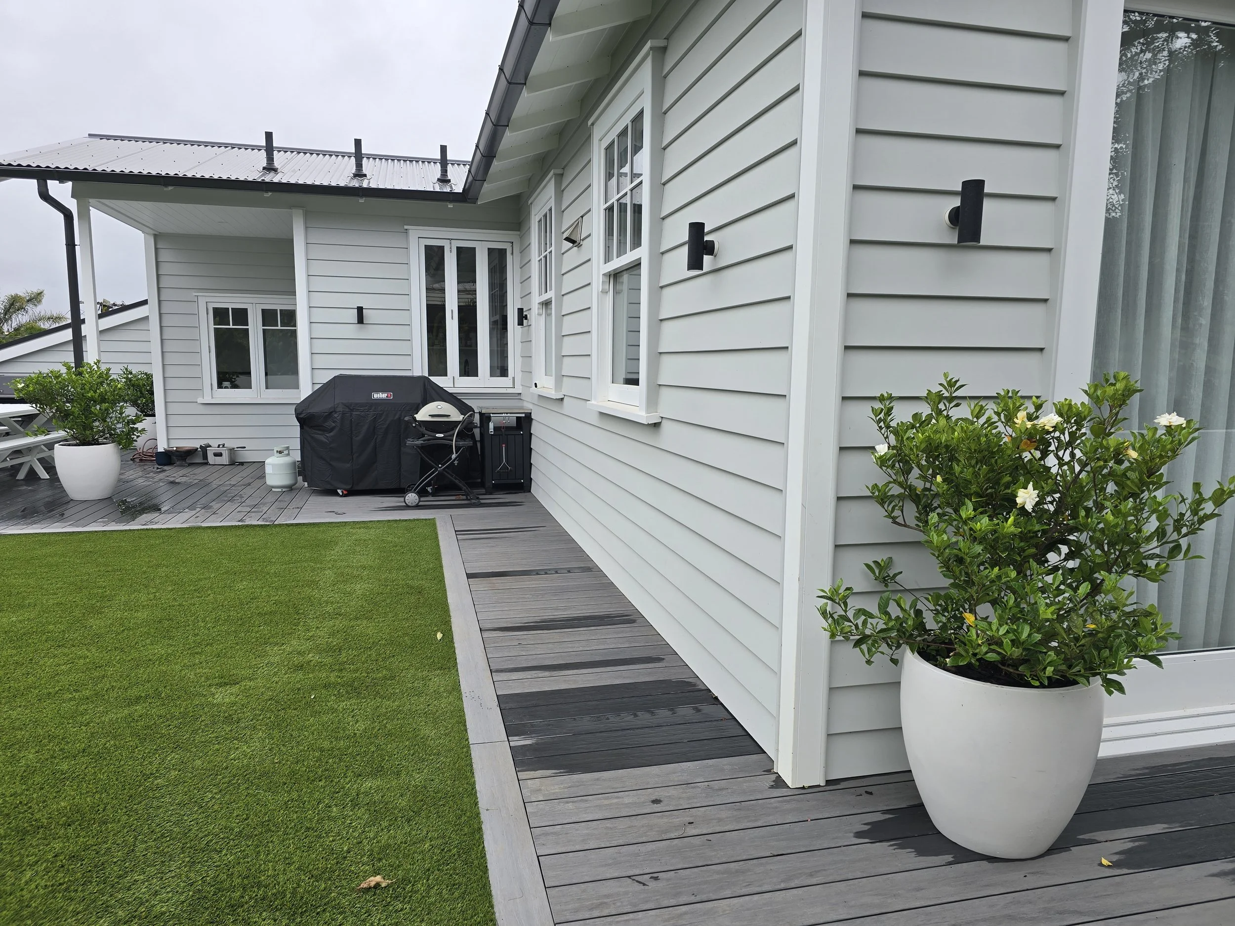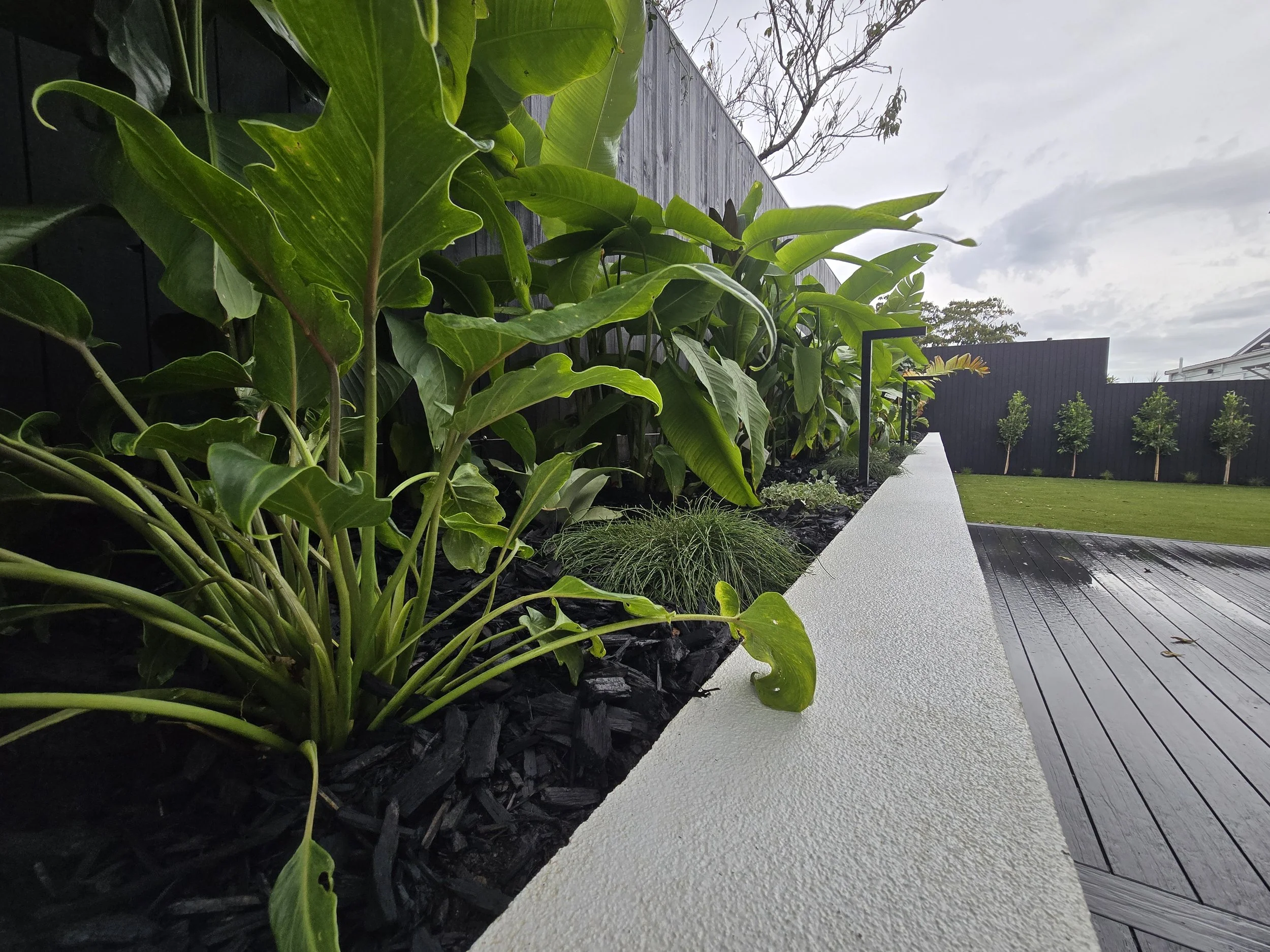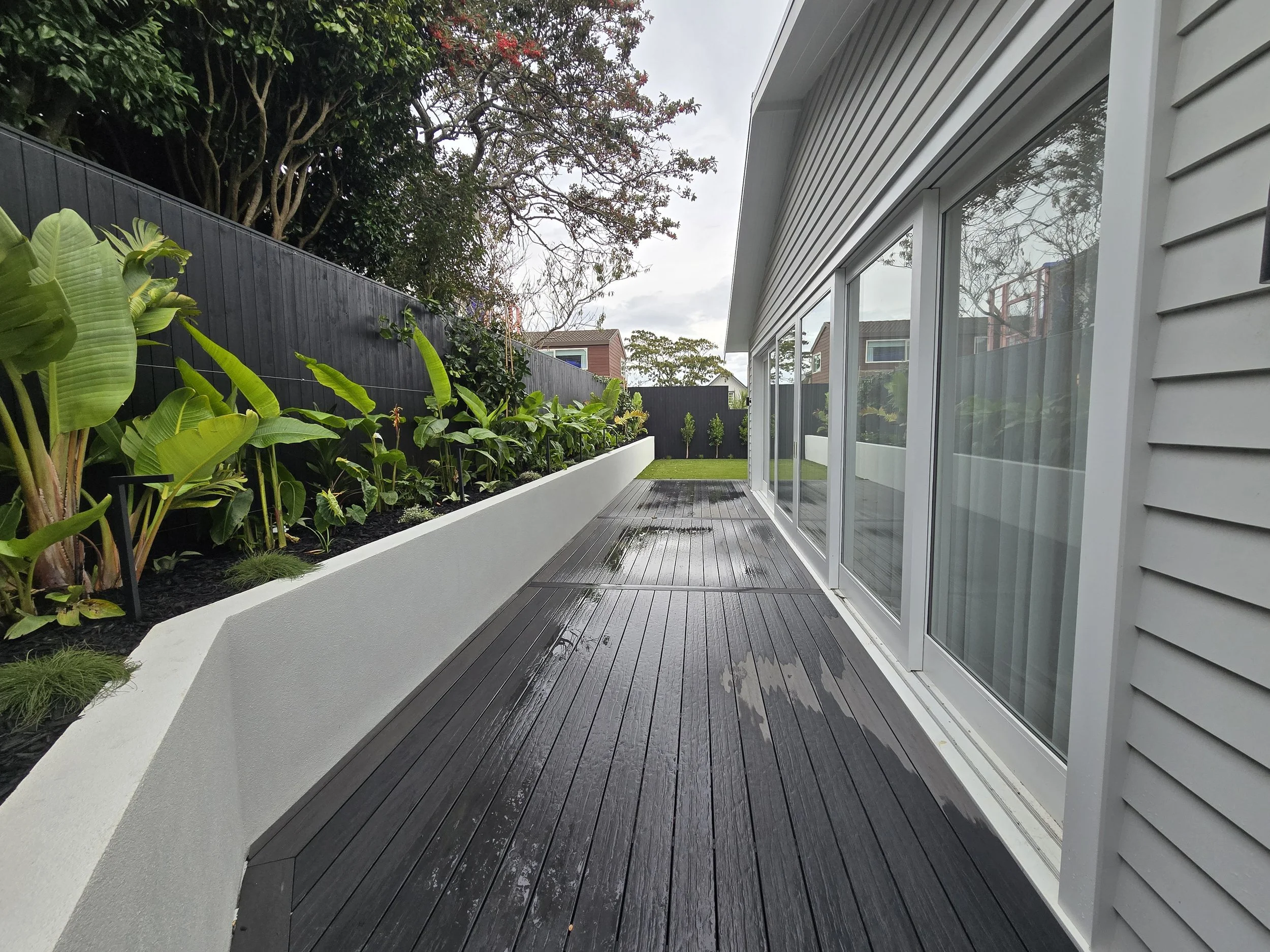 Stabi- Decking, Artificial Lawn, Wire Fencing, Custom Lighting, Garden Bed, Cedar Privacy Fence, Subtropical Planting, Irrigation